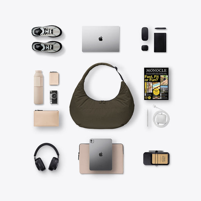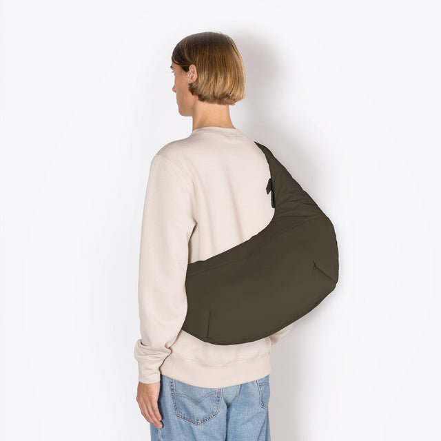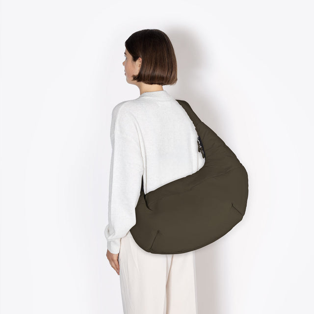 Shaped like a croissant, this extraordinary bag can be comfortably worn around the body. With its puffy style, the Shota Bag is a statement accessory that adds a striking accent to your look. The handles emerge elegantly from one side of the bag, giving it a unique, sculptural silhouette. In true minimalist style, there is only one hidden zip pocket outside for quickly accessible items. Inside, Shota offers plenty of storage space and a further zip pocket.