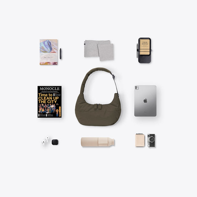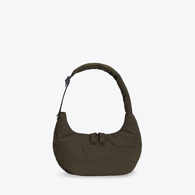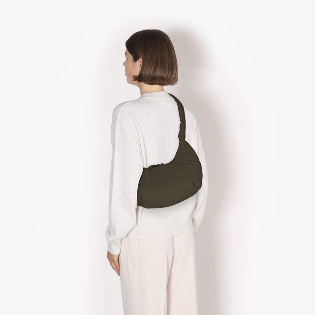 Shaped like a croissant, this extraordinary bag can be comfortably worn around the body. With its puffy style, the Shota Bag is a statement accessory that adds a striking accent to your look. The handles emerge elegantly from one side of the bag, giving it a unique, sculptural silhouette. In true minimalist style, there is only one hidden zip pocket outside for quickly accessible items. Inside, Shota offers plenty of storage space and a further zip pocket.